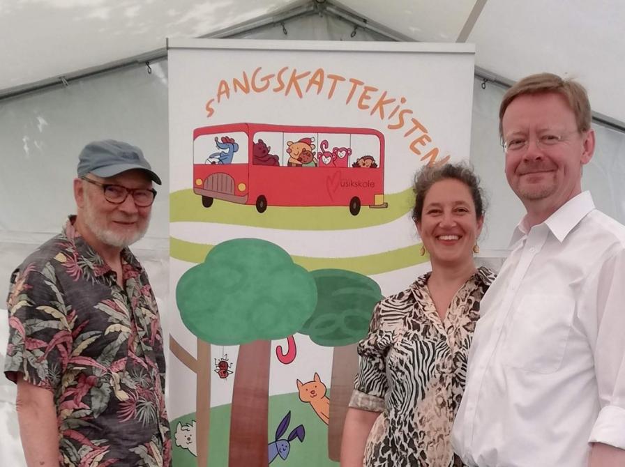 Sangskattekisten sætter gang i børnene og deres voksne med velsvingende musik. De spiller de gode gamle børnesange som 'Hjulene på bussen,' 'Jeg gik mig over sø og land' og det store hit 'Fem små aber.'