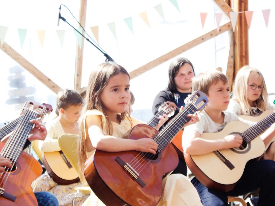 Suzuki guitar-elever spiller små musikstykker på guitar - alene, sammen med deres forældre og alle sammen i flok. Lily Salamanca Jastram er underviseren.