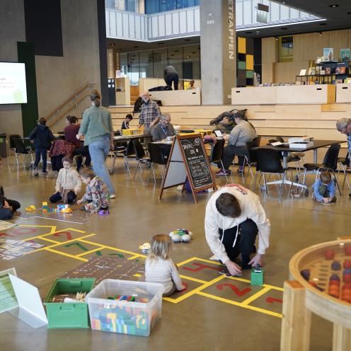 Denne torsdag handler det bl.a. om at bygge børsterobotter til at bevæge sig overraskende rundt på gulvet, og om at lege med forskellige andre robotter. Børn fra toårsalderen og op ligger, kravler og står, mens de fascineret kigger på de robotter, de har bygget eller programmeret sammen med deres voksne. Ved borde sidder forældre og børn og bygger og programmerer LEGO-robotter.